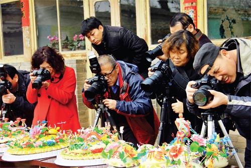 近日,中國(guó)民俗網(wǎng)、中國(guó)旅游網(wǎng)攝影記者和業(yè)余攝影愛好者30余人聚集在原平市衛(wèi)村面塑藝人趙佩云家中,全程拍攝山西非物質(zhì)文化遺產(chǎn)面塑食品的制作過(guò)程。面塑是山西民間喜聞樂見的一種食品,原平市衛(wèi)村面塑藝人趙佩云融合了歷史文化和民間藝術(shù),制作的面塑做工考究,形式多樣,色澤艷麗,受到了人們的追捧,吸引了眾多記者的鏡頭。(吉建平 攝)