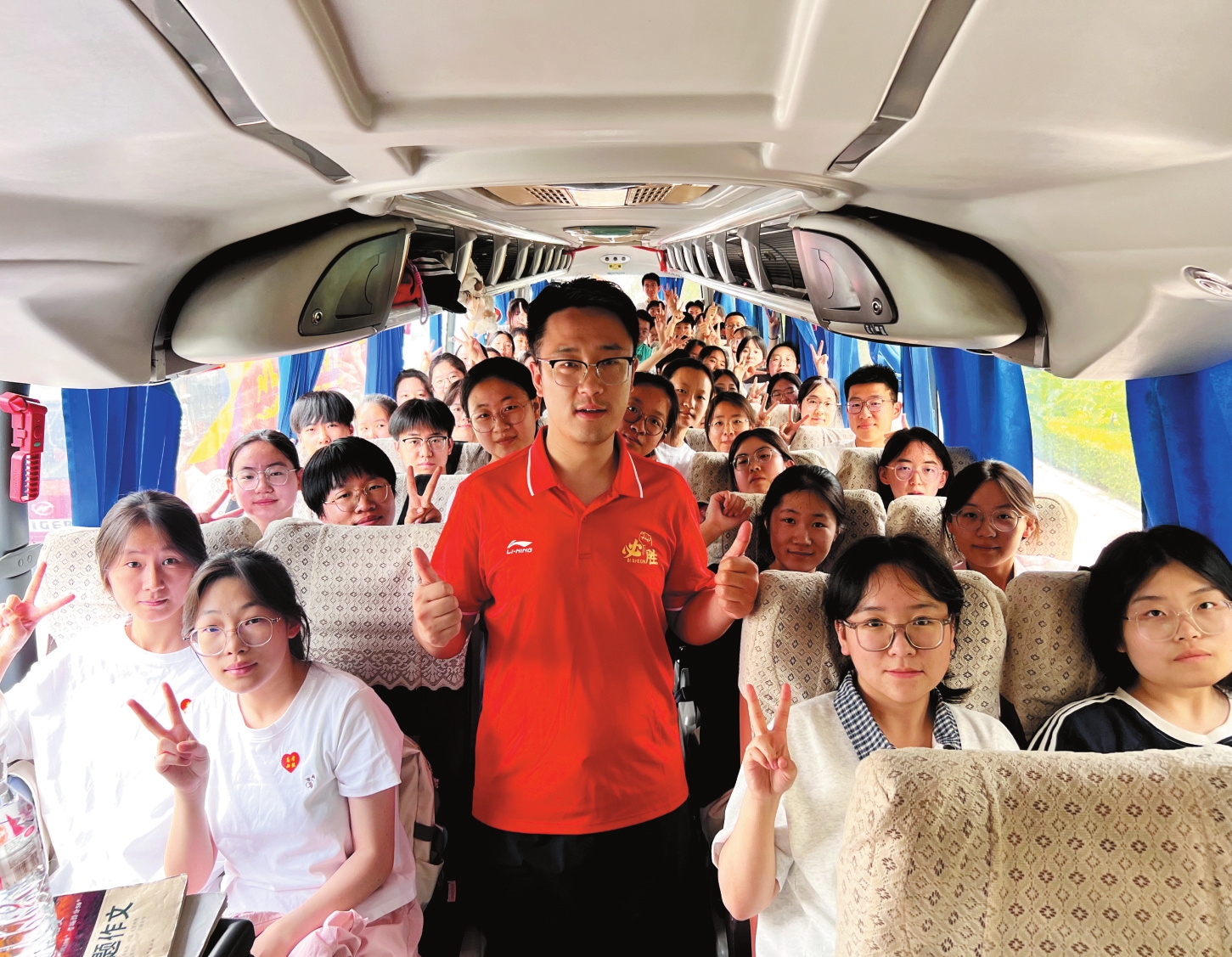 圖為第一場考試結(jié)束后,忻州實(shí)驗(yàn)中學(xué)送考車上,師生互相鼓勁加油。趙臻宇攝