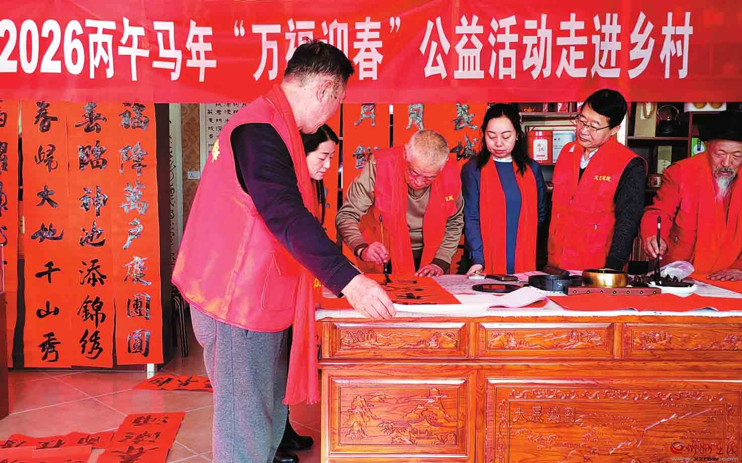 神池縣文聯(lián)、縣書(shū)法家協(xié)會(huì)積極響應(yīng)省市“萬(wàn)福迎春走進(jìn)鄉(xiāng)村”公益活動(dòng)號(hào)召,發(fā)動(dòng)本地文學(xué)愛(ài)好者創(chuàng)作兼具地域風(fēng)情與年俗韻味的原創(chuàng)春聯(lián),近日,兩單位聯(lián)合組織書(shū)法愛(ài)好者深入鄉(xiāng)村,為村民義務(wù)書(shū)寫(xiě)春聯(lián)?;顒?dòng)現(xiàn)場(chǎng)墨香四溢,一幅幅帶著鄉(xiāng)土溫度的春聯(lián)紅遍村頭巷尾,暖心舉措深受群眾交口稱贊。(楊晉明攝)