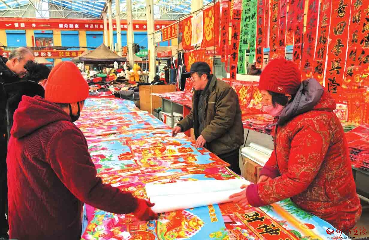 春節(jié)臨近,神池縣集貿市場迎來購銷兩旺的高峰期,處處洋溢著喜慶祥和的節(jié)日氛圍。圖為春聯(lián)年畫攤位前,市民正在精心挑選心儀的年貨。(鄭志東 攝)