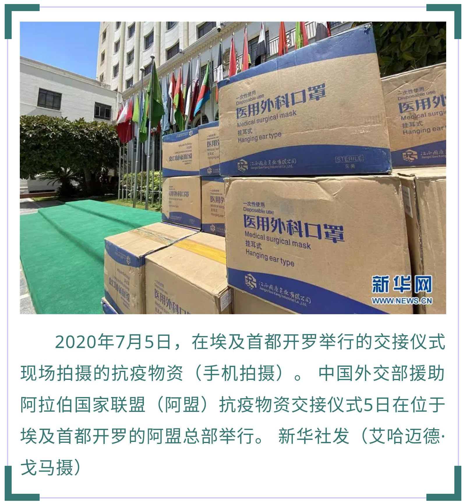 7月5日,中國(guó)外交部援助阿盟抗疫物資交接儀式在開羅舉行。中國(guó)駐埃及大使廖力強(qiáng)代表中國(guó)外交部向阿盟副秘書長(zhǎng)胡薩姆·扎基移交了防護(hù)口罩。據(jù)廖力強(qiáng)介紹,新冠疫情暴發(fā)以來(lái),中方向阿拉伯國(guó)家援助了大量物資,毫無(wú)保留地向阿拉伯國(guó)家分享抗疫經(jīng)驗(yàn)和技術(shù),同21個(gè)阿拉伯國(guó)家舉辦了衛(wèi)生專家視頻會(huì)議,向8個(gè)阿拉伯國(guó)家派遣了醫(yī)療組,同時(shí)協(xié)助阿拉伯國(guó)家在中國(guó)采購(gòu)抗疫物資,支持阿拉伯國(guó)家有序復(fù)工復(fù)產(chǎn)。