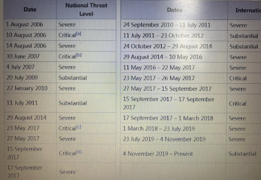 2005年,英國(guó)發(fā)生了震驚中外的倫敦地鐵恐襲爆炸案,共造成56人死亡(包括4名恐怖分子)。2006年8月1日起,英國(guó)警方開始公開發(fā)布國(guó)家安全風(fēng)險(xiǎn)預(yù)警,從低到高,一共有5個(gè)等級(jí)。