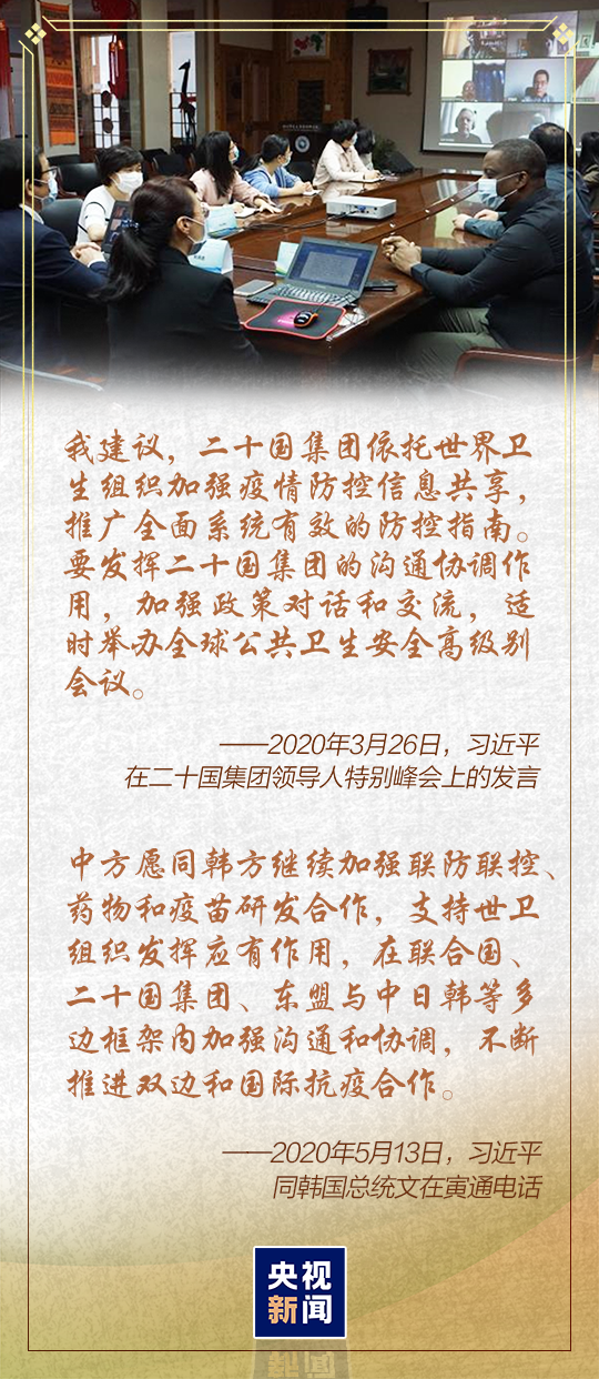 3月26日晚舉行的二十國集團領導人特別峰會上,習近平主席宣布“同各國分享防控有益做法,開展藥物和疫苗聯(lián)合研發(fā)”“探討建立區(qū)域公共衛(wèi)生應急聯(lián)絡機制”“加大向國際市場供應原料藥、生活必需品、防疫物資等產品”……