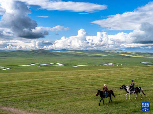 8月19日,在內(nèi)蒙古呼倫貝爾市陳巴爾虎旗,人們?cè)谀獱柛窭蘸优向T馬。(新華社記者 馬金瑞 攝)