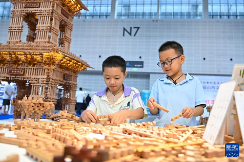 8月21日,兩位小朋友在第七屆山西文化產(chǎn)業(yè)博覽交易會上體驗(yàn)榫卯積木拼搭。(新華社記者 楊晨光 攝)