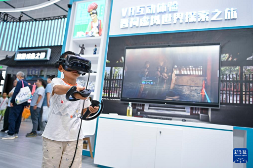 8月21日,一位小朋友在第七屆山西文化產(chǎn)業(yè)博覽交易會上通過VR設(shè)備游覽晉祠。(新華社記者 楊晨光 攝)