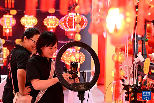 8月24日,商家在位于河北省正定縣的石家莊國(guó)際會(huì)展中心博覽會(huì)現(xiàn)場(chǎng)直播帶貨。(新華社發(fā) 陳其保 攝)