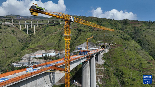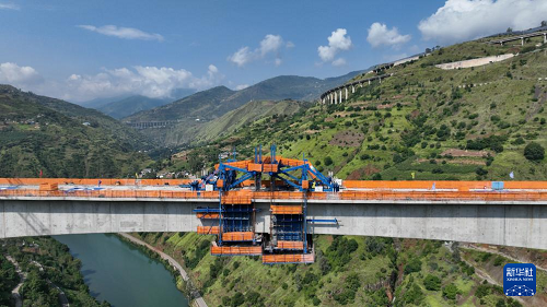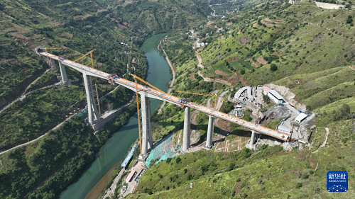 9月7日在云南省昭通市魯?shù)榭h江底鎮(zhèn)拍攝的渝昆高鐵江底牛欄江特大橋合龍現(xiàn)場(無人機照片)。(新華社發(fā) 張廣玉 攝)