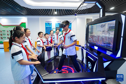 9月8日,江蘇省泰州市姜堰區(qū)淮海小學學生在校園科技館體驗VR項目。(新華社發(fā) 周社根 攝)