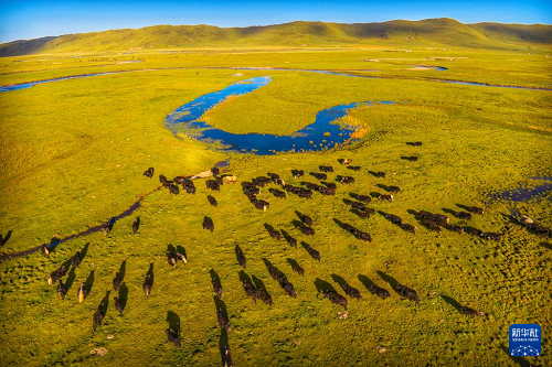 9月13日,在四川阿壩縣,牧民趕著牛群牧歸(無(wú)人機(jī)照片)。(新華社發(fā) 米林 攝)
