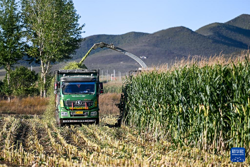 9月18日,在通遼市扎魯特旗巨日合鎮(zhèn),農(nóng)機在田間收割青貯玉米。(新華社記者 連振 攝)
