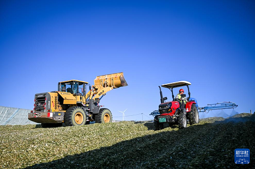 9月18日,在通遼市扎魯特旗巨日合鎮(zhèn),工程車輛噴灑青貯發(fā)酵劑。(新華社記者 連振 攝)