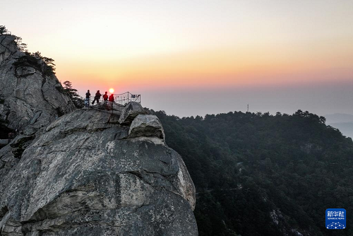 10月9日清晨,幾名游客在龜峰山觀日出(無(wú)人機(jī)照片)。(新華社記者 陳曄華 攝)