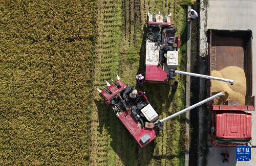 10月10日,湖北省宜昌市秭歸縣沙鎮(zhèn)溪鎮(zhèn)長春村村民駕駛農機在田間收獲水稻(無人機照片)。(新華社發(fā) 雷勇 攝)