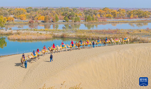 10月18日,游客在新疆巴音郭楞蒙古自治州尉犁縣羅布人村寨景區(qū)東沙山體驗駱駝騎行(無人機照片)。(新華社發(fā) 汪志鵬 攝)