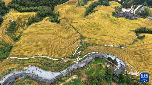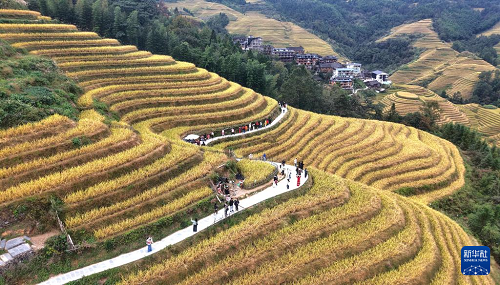 眼下,廣西龍勝各族自治縣龍脊梯田一片金黃,成為眾多游客觀光“打卡”的熱門景點。龍脊梯田已有2300多年歷史,是聯(lián)合國糧農(nóng)組織認證的全球重要農(nóng)業(yè)文化遺產(chǎn)。
