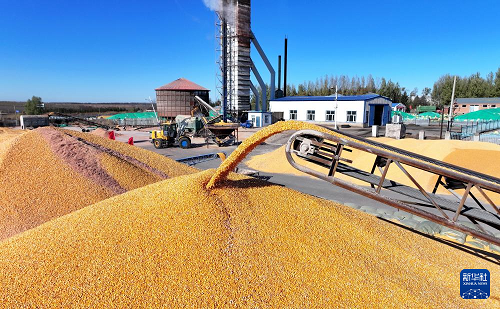 10月23日在北大荒集團(tuán)黑龍江尾山農(nóng)場(chǎng)有限公司一烘干企業(yè)拍攝的玉米烘干作業(yè)現(xiàn)場(chǎng)(無人機(jī)照片)。(新華社發(fā) 陸文祥 攝)