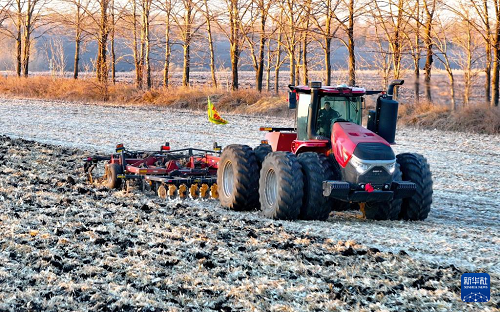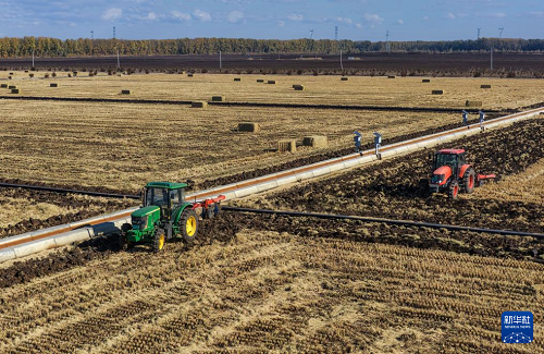 10月23日,農(nóng)機(jī)在黑龍江北大荒農(nóng)業(yè)股份友誼分公司田間進(jìn)行整地作業(yè) (無人機(jī)照片)。(新華社發(fā) 徐宏宇 攝)