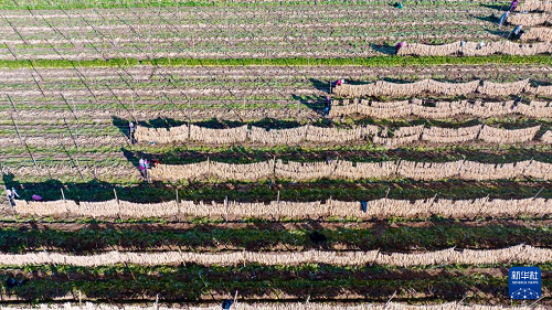 10月29日,農民在寧夏吳忠市紅寺堡區(qū)紅寺堡鎮(zhèn)弘德村晾曬蘿卜條(無人機照片)。(新華社記者 楊植森 攝)