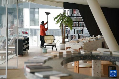 10月29日,在鎮(zhèn)坪縣牛頭店鎮(zhèn)國(guó)慶村,一家山居酒店工作人員在酒店書吧內(nèi)打掃衛(wèi)生。(新華社記者 邵瑞 攝)