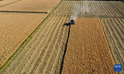 11月2日,河北省遵化市團(tuán)瓢莊鎮(zhèn)山里各莊村農(nóng)民駕駛農(nóng)機(jī)收獲水稻(無(wú)人機(jī)照片)。(新華社發(fā) 劉滿(mǎn)倉(cāng) 攝)