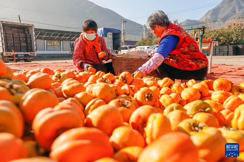 11月1日,河北省遵化市娘娘莊鎮(zhèn)蘆各寨西山村農(nóng)民在場(chǎng)院挑選柿子。(新華社發(fā) 劉滿(mǎn)倉(cāng) 攝)