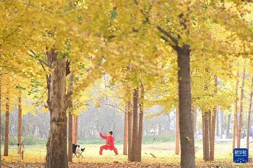 11月4日,市民在石家莊市的河北經貿大學的銀杏林下晨練。(新華社發(fā) 陳其保 攝)
