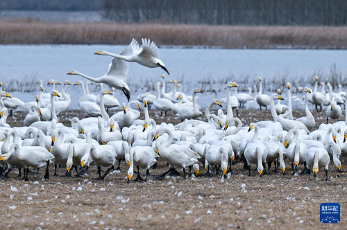 進(jìn)入冬季,大批白天鵝來(lái)到河南省三門峽市黃河濕地棲息越冬。近年來(lái),隨著當(dāng)?shù)夭粩嗉訌?qiáng)黃河沿岸濕地生態(tài)保護(hù)工作,白天鵝的數(shù)量逐年增加。目前,三門峽黃河岸邊40余萬(wàn)畝淺灘濕地已迎來(lái)萬(wàn)余只白天鵝。
