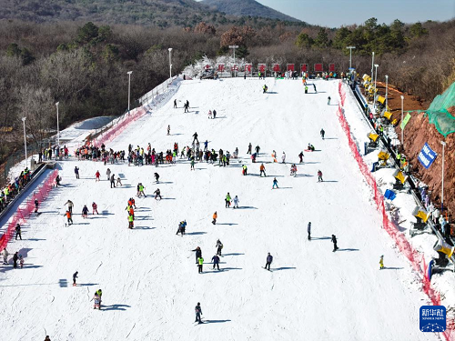 1月11日,游客在江蘇省句容市寶華山滑雪場(chǎng)滑雪(無人機(jī)照片)。(新華社記者 季春鵬 攝)