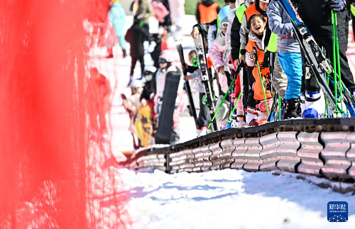 1月11日,游客在江蘇省句容市寶華山滑雪場(chǎng)搭乘“魔毯”。(新華社記者 季春鵬 攝)