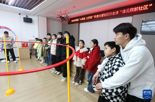 2月12日,在江蘇省連云港市連云區(qū)墟溝街道院前社區(qū)愛心托班,科普志愿者教小朋友操作無人機(jī)。(新華社發(fā) 王春 攝)