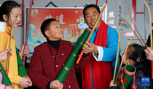 2月13日,文化志愿者在江蘇省海安市墩頭鎮(zhèn)墩西村教寒假公益托管班的學(xué)生學(xué)唱省級(jí)非遺“水鄉(xiāng)道情”。(新華社發(fā) 周強(qiáng) 攝)