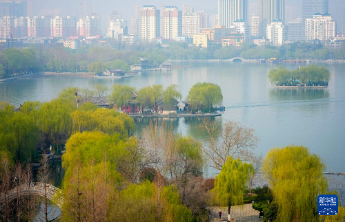 近日,山東省濟南市氣溫回升,大明湖畔的柳樹披上新綠,吸引游客前來踏春游覽。大明湖位于濟南市區(qū),湖岸種有大量柳樹,以“四面荷花三面柳,一城山色半城湖”的風(fēng)光聞名。