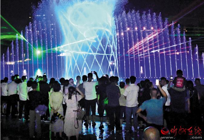 公園在注重園林、景觀建設(shè)的同時,突出主題文化內(nèi)涵的展現(xiàn),湖水噴泉、觀賞果園、主題植物園、階梯花臺等特色園林具有觀賞性,園內(nèi)還配套建有遺山文化館、張拉膜廣場、健舞劇場、休閑茶吧、咖啡館等群眾休閑活動場所,是又一惠及民生的心靈家園。圖為8月1日晚,市民在遺山公園噴泉廣場觀賞絢麗多彩的噴泉燈光秀。劉紀(jì)森 智芝龍 白曉明 胡 煒 攝
