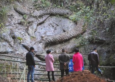 石龍雕刻位于石龍村的石龍溝,在山溝里的一處半山腰上。昨天下午,記者趕到現(xiàn)場(chǎng)時(shí),多名當(dāng)?shù)厝苏谑埾路蕉哑鍪^,準(zhǔn)備做成堡坎,防止石龍周?chē)俦荒嗤良盎卵诼瘛?/p>