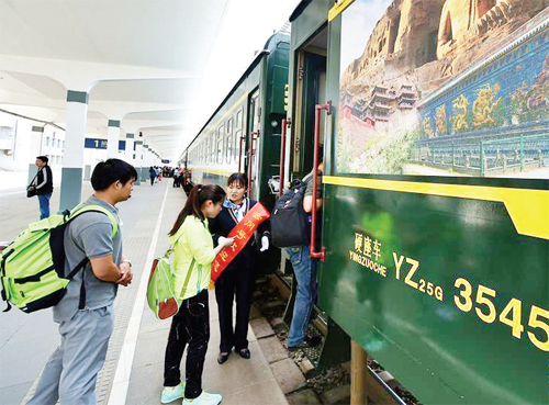 5月27日,旅客在大同火車站檢票登上Y665次列車。當(dāng)日,山西省首趟“Y”(游)字頭城際旅游專列Y665次列車從大同火車站駛出,開往太原,兩座城市間的旅行時(shí)間縮短至3小時(shí)以內(nèi)。這輛被命名為“云岡號(hào)”的一站直達(dá)列車由6節(jié)硬座車、1節(jié)硬臥車、1節(jié)軟臥車組成,每逢周五、六、日發(fā)車,運(yùn)行時(shí)長(zhǎng)較目前兩地開行的最快列車還要節(jié)省近50分鐘。(來源:黃河新聞網(wǎng))
