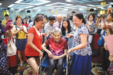 2016年7月9日,重慶雙百歲老人夫妻過生日,子女們特意為他們?cè)诮夥疟宥季频昱e辦了一場(chǎng)雙百盛典。圖/視覺中國(guó)