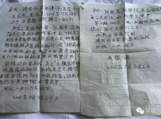 兩封信中敘述到,“河南省高級(jí)人民法院于2015年7月28號(hào)上午11時(shí)親自來(lái)到河南省第四監(jiān)獄提審我,又重新讓我踩了一次腳印。隨后,2015年10月23日,河南省高級(jí)人民法院和洛陽(yáng)市公安局技術(shù)鑒定科又一次將我提出監(jiān)獄,在監(jiān)獄大門口路南邊的野地半坡上,又重新讓我踩了石膏模擬腳印?!?/p>