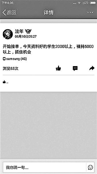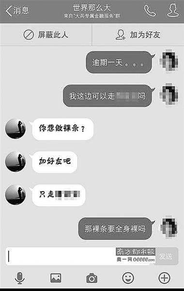以手持身份證的裸照為抵押進(jìn)行借款 可以借款的金額是普通借款額度的2至5倍 ·風(fēng)險(xiǎn) 這些借給她的人里,全都是“假熟人” “他們說(shuō)還不上就把裸照發(fā)給家人、發(fā)給朋友” ·提醒 “借貸平臺(tái)未及時(shí)刪除屏蔽,應(yīng)承擔(dān)連帶責(zé)任” “如果真拿裸照抵押給出借人,從法律上來(lái)講是無(wú)效的” 據(jù)新華社、北京青年報(bào)、南方都市報(bào) ① 活躍在借貸寶平臺(tái)的中介 ②③ 記者與自稱(chēng)可提供服務(wù)的網(wǎng)貸中介的聊天記錄 ④ 借貸者在網(wǎng)上發(fā)布的裸照文件 近日,有網(wǎng)友曝光稱(chēng),通過(guò)網(wǎng)絡(luò)借貸平臺(tái)借貸寶,有女大學(xué)生被要求“裸持”(以手持身份證的裸照為抵押,也被稱(chēng)為“裸條”)進(jìn)行借款,逾期無(wú)法還款將被威脅公布裸照給家人朋友,且借款周利息高達(dá)30%。 13日,記者調(diào)查發(fā)現(xiàn),在一些借款群中,女大學(xué)生“裸持”借款已經(jīng)成為公開(kāi)的秘密,通過(guò)“裸持”可以借款的金額是普通借款額度的2至5倍,但逾期未還將面臨裸照被公布的威脅,甚至有借款人威脅“裸持”借款的女生提供性服務(wù)。 對(duì)于上述情況,借貸寶稱(chēng),高息、“裸持”等是用戶(hù)私下的個(gè)人行為,該公司無(wú)權(quán)干涉,并表示“出借款風(fēng)險(xiǎn)需要自擔(dān)”。 有律師表示,借貸平臺(tái)作為服務(wù)提供者,對(duì)顯而易見(jiàn)的違法信息負(fù)有監(jiān)測(cè)排除的義務(wù),特別是經(jīng)過(guò)借貸者反映投訴的,未及時(shí)刪除、屏蔽,應(yīng)承擔(dān)連帶責(zé)任。 “一次借一周, 一周的利息是30%” 12日晚,記者聯(lián)系上一位“裸持”的借款人林曉(化名),這個(gè)來(lái)自江蘇的女大學(xué)生現(xiàn)在正被債主威脅公布她的裸照。 林曉說(shuō),今年2月,因?yàn)閯?chuàng)業(yè)開(kāi)網(wǎng)店需要進(jìn)貨,她通過(guò)“借貸寶”向平臺(tái)上的“熟人”借了500元錢(qián)。“一次借一周,一周的利息是30%,還的時(shí)候要還650元。”一周后,因?yàn)椤坝馄凇边€不上這些錢(qián),林曉又在平臺(tái)上發(fā)布借款標(biāo),向其他“熟人”借錢(qián)還上第一筆借款。 所謂“熟人”是使用借貸寶的成員間的核心關(guān)系,一個(gè)人想通過(guò)借貸寶借到錢(qián),只能向其添加為“熟人”的聯(lián)系人借錢(qián),而其他用戶(hù)則看不到此人的借款信息。借貸寶平臺(tái)方默認(rèn)“熟人”之間是相互熟識(shí)的,所以平臺(tái)不承擔(dān)借貸風(fēng)險(xiǎn),而由借款人和出借人雙方自擔(dān)。 但是這里的“熟人”卻往往不是真正的熟人。林曉稱(chēng),在平臺(tái)之外,一些需要借款的學(xué)生和出借人都在幾個(gè)QQ群里,想借多少錢(qián)、什么時(shí)候還,這些條件談好后在借貸寶上互相添加好友,而這些人其實(shí)互相根本就不認(rèn)識(shí)。 索要家庭地址 和家人聯(lián)系方式 這種“假熟人”的借貸關(guān)系往往伴隨著高利貸。 林曉借的錢(qián)越來(lái)越多,30%的利息下,很快500、1000的小額貸款就滿(mǎn)足不了林曉拆東墻補(bǔ)西墻的需求了。“這時(shí)候就看到群里有中介說(shuō),女大學(xué)生可以‘裸持’借款,即使有‘負(fù)債’也沒(méi)關(guān)系,發(fā)送裸照給老板就能借到更多錢(qián)。” 林曉回憶,通過(guò)中介,她聯(lián)系了一位出借人,對(duì)方要求林曉發(fā)送自己的生活照、姓名、身份證、家庭地址和家人聯(lián)系方式,以及幾名同學(xué)的聯(lián)系方式,并索要了林曉手持身份證的幾張裸照和視頻,核實(shí)信息后借出了5000元給她。 即便“裸持”,能借到的也依然是周利率30%的高利貸,毫無(wú)懸念,林曉最后根本還不起。 “裸持”借款逾期后,林曉曾遭到借貸寶平臺(tái)的催款,此時(shí),出借人也開(kāi)始威脅她?!八麄兙屯{說(shuō)還不上就把裸照發(fā)給家人、發(fā)給朋友?!?/p> 高利貸越滾越大,林曉通過(guò)借貸寶平臺(tái)總共向15人先后借款12萬(wàn)余元,但只短短4個(gè)月時(shí)間,債務(wù)就已經(jīng)滾到了25萬(wàn)余元。這些借給林曉錢(qián)的人里,沒(méi)有一個(gè)是她真正認(rèn)識(shí)的人,全都是“假熟人”,林曉根本就不知道這些人的真實(shí)身份。 越滾越大的債務(wù)還不是最致命的,林曉的裸照捏在3個(gè)人手里,只要林曉不能按期還錢(qián),他們就威脅將林曉的裸照公布到網(wǎng)上,并發(fā)給她的家人和朋友。林曉被逼得沒(méi)有辦法,最終只得將此事告知家人,在家人的幫助下,慢慢還高息貸款,“但到現(xiàn)在還有將近6萬(wàn)元沒(méi)還上”。 調(diào)查 強(qiáng)調(diào)需要“露臉” “資質(zhì)好可以1萬(wàn)元” 新華社記者調(diào)查發(fā)現(xiàn),名目繁多的校園網(wǎng)絡(luò)貸款方式日漸風(fēng)靡,一些具有高利貸性質(zhì)的借貸平臺(tái)令不少學(xué)生陷入困局。 “第三方校園借貸平臺(tái)大多是高利貸平臺(tái)?!焙幽显埪蓭熓聞?wù)所律師付建認(rèn)為,一些第三方校園借貸平臺(tái)利用學(xué)生金融知識(shí)匱乏以及虛榮心態(tài),鉆監(jiān)管的空子,打法律擦邊球謀取暴利。 13日,記者以學(xué)生身份加入幾個(gè)借款群,詢(xún)問(wèn)是否可以借錢(qián)后,幾名“中介”添加記者為好友。中介稱(chēng):如果多