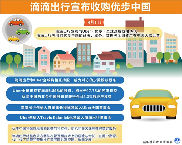 1日,滴滴出行宣布與Uber全球達成戰(zhàn)略協(xié)議,滴滴出行將收購優(yōu)步中國的品牌、業(yè)務、數(shù)據(jù)等全部資產(chǎn),在中國大陸運營。