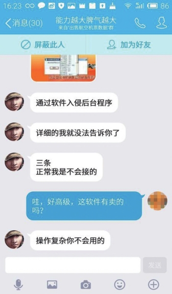 記者以求購(gòu)機(jī)票信息為名在網(wǎng)上找到了十幾名以此為業(yè)的QQ用戶。其中,用戶名為“能力越大脾氣越大”的用戶告訴記者,每條航空機(jī)票信息售價(jià)18元,可以挑選特定的航空公司,買(mǎi)多了,價(jià)格還可以優(yōu)惠。他告訴記者,自己是通過(guò)軟件入侵后臺(tái)程序“調(diào)取”機(jī)票信息,而且都是客戶有需求的時(shí)候才去“調(diào)取”,保證信息新鮮有效。