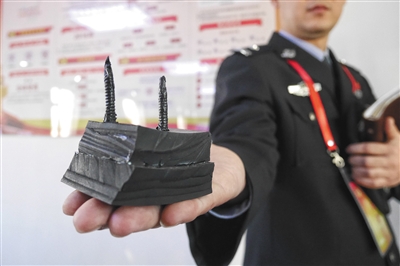 昨日,民警展示盜竊團(tuán)伙用來(lái)扎汽車輪胎的作案工具“膠皮釘”。新京報(bào)記者 王嘉寧 攝