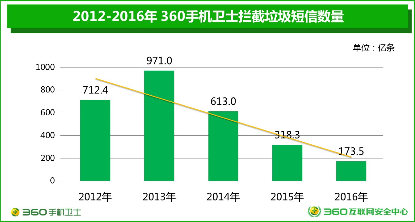 360手機衛(wèi)士日前發(fā)布的《2016年中國手機安全狀況報告》顯示,去年360手機衛(wèi)士共為全國用戶攔截各類垃圾短信約173.5億條,相較于2012年的700多億,降幅高達75.6%,五年來整體呈現(xiàn)快速下降的趨勢。