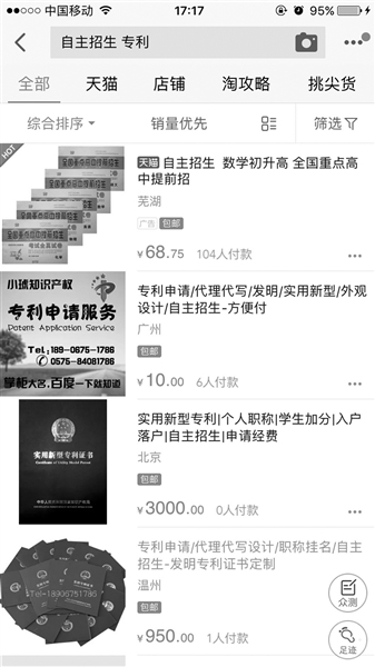 2017年的高校自主招生即將拉開大幕。在往年自主招生中,不少高校都將獲發(fā)明專利或有發(fā)明成果列為自主招生報(bào)名資格的條件之一,而這一條件也催生出了一個(gè)“專利買賣”、“專利辦理”的市場(chǎng)。北京青年報(bào)記者了解到,一些專利代理公司聲稱可提供專利申請(qǐng)和轉(zhuǎn)讓服務(wù),以幫助考生獲得自主招生的“敲門磚”。專家表示,專利允許轉(zhuǎn)讓,也不會(huì)對(duì)被轉(zhuǎn)讓人的資格進(jìn)行審查,但自主招生的高校應(yīng)在這方面加強(qiáng)管理。 針對(duì)高校自主招生 網(wǎng)上有人買賣專利 近日,北青報(bào)記者在百度貼吧上發(fā)現(xiàn),有專人提供能讓考生在高考、大學(xué)畢業(yè)、考研等事情尋求“便利”的專利證書購買方法。 有聲稱可以辦理專利的賣家在貼吧上發(fā)布廣告稱,“申請(qǐng)實(shí)用新型專利,參加自主招生必備”,并表示“你擁有了專利,就比別人領(lǐng)先了一步”。 據(jù)了解,有部分顧客尋求購買專利的原因是希望可以獲得自主招生考試資格。此前,有網(wǎng)友曾將認(rèn)可專利和論文的自主招生學(xué)校名錄加以盤點(diǎn),在名錄中,北青報(bào)記者看到,國內(nèi)數(shù)十所高校均認(rèn)可發(fā)明創(chuàng)造或者發(fā)明專利,擁有一張專利證書或已成為參加自主招生考試的“敲門磚”。 市場(chǎng)需求使得部分專利代理公司打起了高中學(xué)生群體的主意。北青報(bào)記者在淘寶網(wǎng)上以“自主招生專利”為關(guān)鍵詞進(jìn)行搜索,發(fā)現(xiàn)有多家知識(shí)產(chǎn)權(quán)服務(wù)機(jī)構(gòu)的網(wǎng)店寫明可以提供“專利申請(qǐng)”、“專利轉(zhuǎn)讓”等服務(wù),并注明專利是“自主招生考試通行證”。 除了可以用于自主招生外,有機(jī)構(gòu)聲稱,專利證書還可以在職稱評(píng)定、考研加分、出國留學(xué)和落戶上享受一定的便利條件。 在一家機(jī)構(gòu)網(wǎng)店上,北青報(bào)記者看到,曾經(jīng)購買過“實(shí)用新型專利申請(qǐng)或轉(zhuǎn)讓”的賣家評(píng)價(jià)稱,“感覺很方便,不用自己一個(gè)人絞盡腦汁熬夜了,服務(wù)為自己省了很多力,果然人多力量大,相信最后能拿到證書?!?/p> 一名任職于大興區(qū)某高級(jí)中學(xué)的老師向北青報(bào)記者介紹,如果使用專利證明報(bào)考高校自主招生,需要整理并提供相關(guān)資料給申請(qǐng)的學(xué)校,“一般來說,需要準(zhǔn)備的資料包括證書、專利說明、合作人信息和是否有專利號(hào),如果有專利號(hào)通過的幾率則更大,如果沒有專利號(hào)則需要得到學(xué)校認(rèn)可。將這些材料送到學(xué)校進(jìn)行審核,如果審核通過,將可能享受直接降分或者有資格參加自主招生考試?!?/p> 機(jī)構(gòu)代辦專利證書 兩種途徑價(jià)格不同 據(jù)了解,目前國內(nèi)專利證書分為三種:發(fā)明專利證書、實(shí)用新型專利證書和外觀設(shè)計(jì)專利證書。 北青報(bào)記者向一家專利代理機(jī)構(gòu)進(jìn)行咨詢,據(jù)負(fù)責(zé)人王川(化名)介紹,他們可以為需要的考生提供“實(shí)用新型專利”轉(zhuǎn)讓服務(wù),價(jià)格為3000元,兩個(gè)月左右可以辦成。而指定提供“實(shí)用新型專利”的原因是,實(shí)用新型更為方便獲得,發(fā)明專利則較難獲得。 王川介紹,辦理專利只需考生提供姓名、地址、身份證號(hào)碼和聯(lián)系方式等信息就可以,其余操作則全由他們公司進(jìn)行?!霸谛畔⑻峁┙o我們之后,我們會(huì)向?qū)@痔岢鰧@畔⒆兏暾?qǐng),專利局會(huì)審核,審核通過后,這個(gè)專利就是你的了。變更完成后,再繳納相應(yīng)的證書費(fèi)。最后,證書原件上的名字就是你的名字了?!?/p> 王川表示,目前公司提供可以轉(zhuǎn)讓的這些專利是處于“審核通過”狀態(tài),沒有進(jìn)行繳費(fèi),“還沒有獲得實(shí)體證書,需要先轉(zhuǎn)讓到你名下,然后去繳納獲得證書的費(fèi)用,交完錢專利局才會(huì)制作證書。”這樣通過轉(zhuǎn)讓獲得的專利,可以保證買方既有使用權(quán),同時(shí)也是專利的發(fā)明人?!稗D(zhuǎn)讓完成后,可以在網(wǎng)站上查詢到,也可以打?qū)@蛛娫挷樵?。這個(gè)完全不違法,都是正常的商業(yè)行為?!蓖醮ㄕf。 北青報(bào)記者還了解到,除了可以通過專利轉(zhuǎn)讓獲得專利證書外,還有機(jī)構(gòu)聲稱可提供專利申請(qǐng)服務(wù),從而保證從申請(qǐng)到證書獲得的全過程,都有申請(qǐng)者本人的名字,并稱這種方式更加“靠譜”。 據(jù)一所專利代理公司的員工張慶(化名)稱:“現(xiàn)在市場(chǎng)有這個(gè)需求,學(xué)生確實(shí)挺需要的,有了自主招生之后,相當(dāng)于多考了30分。”張慶介紹說,他的專利代理公司可以提供更“安全”的方式,即一開始便用考生的名字來申請(qǐng)專利,“轉(zhuǎn)讓的專利不靠譜,招生單位一查就查出來了,得原始創(chuàng)新才行?!?/p> 張慶說,無論是發(fā)明專利證書還是實(shí)用新型專利證書他都可以為考生申請(qǐng),實(shí)用新型專利申請(qǐng)上相對(duì)簡(jiǎn)單,“因?yàn)閷?shí)用新型不經(jīng)過‘實(shí)質(zhì)審查’,不看你的發(fā)明創(chuàng)造有多大的高度,只考慮形式上是否滿足要求,基本上按照格式文檔寫個(gè)材料就行?!倍l(fā)明專利證書更難,所需時(shí)間會