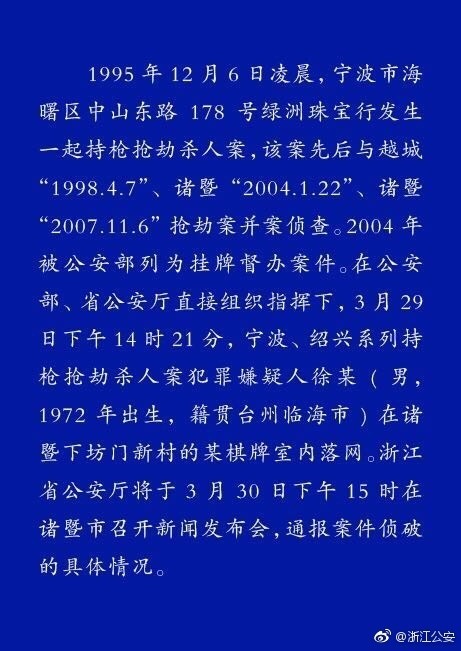 官方通報 最新消息:浙江省公安廳將于3月30日下午15時在諸暨市召開新聞發(fā)布會,通報案件偵破的具體情況。 盡管已過去了22年 綠洲珠寶行已從原來的中山東路搬到天一廣場 但說到轟動浙江的“綠洲珠寶行搶劫殺人案” 很多“老寧波”還是記憶猶新