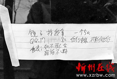 “不但我們家的車輛被撬掉反光鏡,周圍還有四五輛車。”張女士說,令人氣憤的是,小偷盜竊反光鏡之后,還專門在車上留下寫有QQ號的紙條,說可以花50元贖回反光鏡,“紙條上還說,如果不花錢贖回,將來麻煩不斷。”