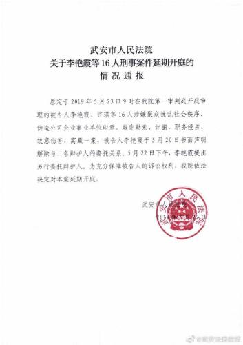通報還稱,原定于2019年5月23日9時在武安市人民法院第一審判庭開庭審理的被告人李艷霞、許琪等16人涉嫌聚眾擾亂社會秩序偽造公司企業(yè)事業(yè)單位印章、敲詐勒索、詐騙、職務侵占、故意傷害、窩藏一案,被告人李艷霞于5月20日書面聲明解除與二名辯護人的委托關系。5月 22日下午,李艷霞提出另行委托辯護人。為充分保障被告人的訴訟權利,武安市人民法院依法決定對本案延期開庭。
