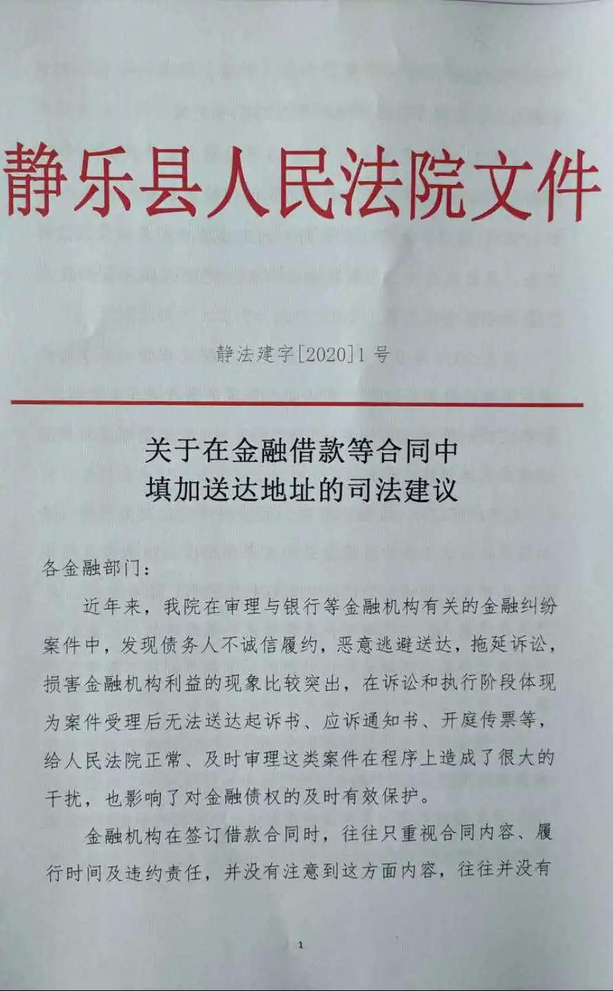 為進(jìn)一步提高金融借款合同糾紛案件法律文書直接送達(dá)、郵寄送達(dá)的成功率,破解送達(dá)難題,縮短金融借款合同糾紛案件的審理周期,有效防范和化解金融機(jī)構(gòu)經(jīng)營風(fēng)險(xiǎn),靜樂法院在多次深入金融部門進(jìn)行調(diào)研的基礎(chǔ)上,結(jié)合相關(guān)法律規(guī)定,經(jīng)審判委員會(huì)討論,決定向金融部門送達(dá)《關(guān)于有效維護(hù)金融債權(quán)解決“送達(dá)難”在合同中約定送達(dá)地址的司法建議》。建議銀行、金融機(jī)構(gòu)在簽訂合同時(shí)制作規(guī)范化、模板化合同條款,提出以合同中約定送達(dá)地址并明確法律責(zé)任的方式,解決非訴階段、仲裁、訴訟等程序中的“送達(dá)難”問題,從而在當(dāng)前經(jīng)濟(jì)形勢(shì)下有效維護(hù)金融債權(quán),促進(jìn)合同當(dāng)事人履行誠信義務(wù)。