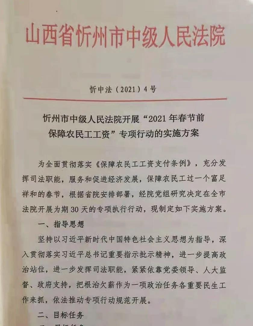 為全面貫徹落實(shí)《保障農(nóng)民工工資支付條例》,充分發(fā)揮司法職能,保障農(nóng)民工過一個(gè)富足祥和的春節(jié),忻州中院黨組于近期在全市法院范圍開展了為期30天的“2021年春節(jié)前保障農(nóng)民工工資”專項(xiàng)執(zhí)行行動(dòng)。