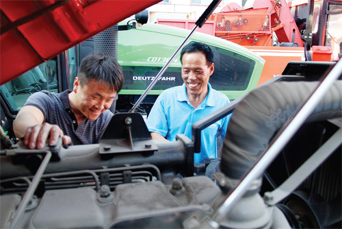 7 月13 日,兩位農(nóng)民在原平市農(nóng)機(jī)公司選購(gòu)?fù)侠瓩C(jī)。近年來(lái),原平市落實(shí)各項(xiàng)惠農(nóng)政策,極大地調(diào)動(dòng)了農(nóng)民購(gòu)買(mǎi)和使用農(nóng)機(jī)具的積極性,在小麥?zhǔn)崭罱咏猜曋H,農(nóng)民抓緊時(shí)間選購(gòu)?fù)侠瓩C(jī)等國(guó)家補(bǔ)貼農(nóng)機(jī)具,為在麥田地里進(jìn)行夏播做準(zhǔn)備。(褚震 攝)
